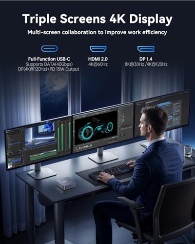[ULTRA-FAST CONNECTIVITY USB4 &WIFI 6E, 2.5G LAN, TRIPLE DISPLAY] Equipped with WiFi 6E, Bluetooth 5.2, and a 2.5GbE LAN port—delivering lag – free online meetings and stable high – speed networking for this mini pc. Its USB4 port takes performance further: boasting up to 40Gbps transfer speeds, it moves a 3GB 4K video in just 1 second and unlocks seamless connections with Thunderbolt 3/4 devices, high – speed NVMe SSDs, or even eGPUs for boosted performance. It also supports DisplayPort Alt – Mode, letting you drive a 4K 60Hz monitor directly—paired with other video ports, this enables triple display output for expanded multitasking on the mini pc windows 11.