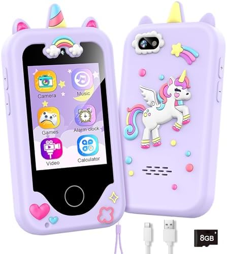 Perfect Gift for Girls Boys Age 3-8:Kids’ phones are small and lightweight,safe materials, not harmful.It is a birthdays,Christmas gifts for 3, 4, 5, 6, 7 ,8 ,9 ,10 years old boys and girls..It comes with 1*kids smartphone,1*smartphone case,1*8GB SD card ,1*neck lanyard,1*user manual,1*USB-type C.