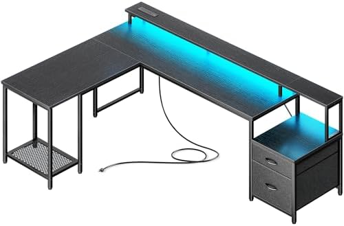 【RGB LED Light Strip 】Create your perfect setup with RGB LED lights on the gaming desk with storage — 12 dynamic modes, adjustable brightness and speed, or use the app to unlock 60,000+ colors. Turn on mic mode for music-reactive lighting, or schedule ambient hues for night work or relaxing game nights by using this corner gaming desk