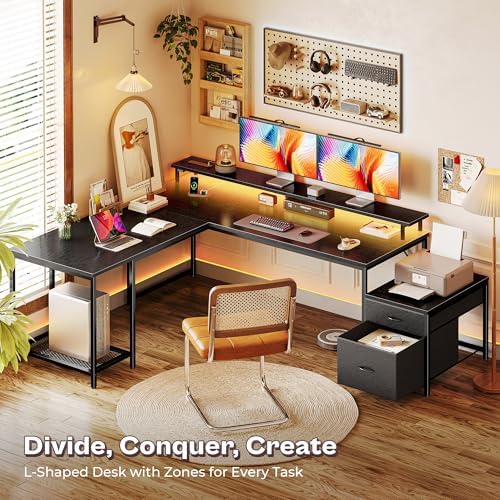 【Computer Desk with Charging Station】Tired of extension cords under the l shaped desk with storage? Built-in charging station includes 4 AC outlets, 1 USB-C ports, and 2 USB-A port, perfect for powering your laptop, phone, pad, or camera all at once. The large bedroom desk is great for creators, remote workers, or gamers with multiple devices