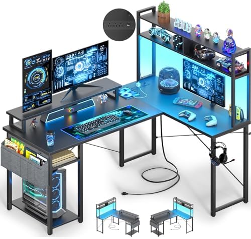 Besiost 48” L Shaped Desk Gaming Desk with Monitor Stand, Power Outlet, Led Strip for Home Office