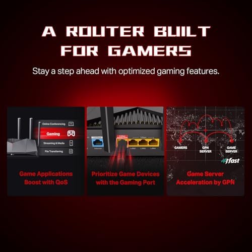This high-performance gaming router is equipped with a wide range of performance features for a next-gen gaming user experience, including Game Server Acceleration by GPN, Smart Connect (Band Steering), MU-MIMO, OFDMA, TWT (Target Awake Time), BSS Color, 4K-QAM, IoT network, AP mode, and VPN server and client. Additional features include parental controls, QoS by device, access control, IPTV, IPv6, guest network, LED control, port forwarding, USB sharing, PoE, dynamic DNS, VPN pass-through, and cloud management, all managed through the Tether app. The router supports up to 90 connected devices and works seamlessly with Alexa and Google Assistant.