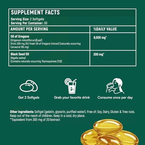 Softgels with Black Seed Oil 6000mg – Organic Oregano Oil Capsules for Immune & Digestive Support – Non-GMO, Gluten-Free Softgels – 120 Count (Pack of 2)