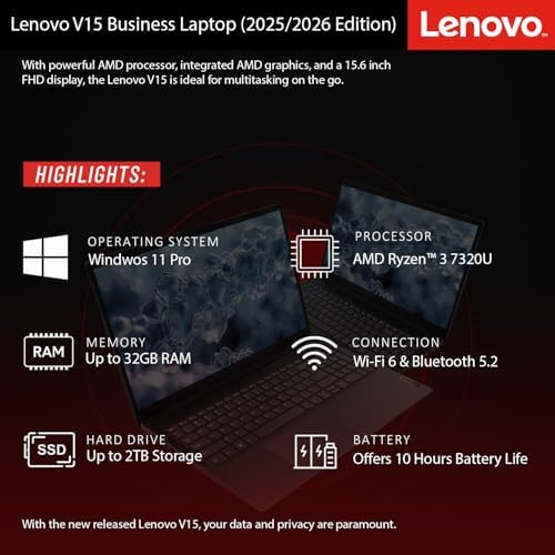 Home Featured Lenovo 2026 Latest Business and Student Laptop, Ryzen 3 7320U(Outperforms Intel i7-1065G7), 16GB DDR5, 2TB PCIE, 15.6″ FHD IPS Display, Wi-Fi 6, Bluetooth 5.3, Long Battery Life, Windows 11 Pro