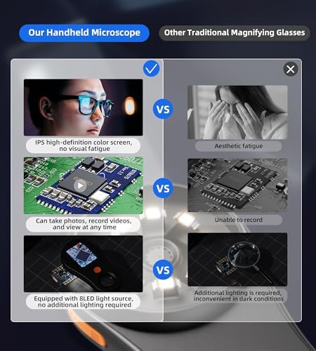 200W HD Pixels: HD 1920x1080P, with 2.0 inch IPS color high definition screen, realistic colors, 178 ° visual angle. Compared to traditional magnifying glasses with light, this microscope does not shake the eyes and reduces eye fatigue.