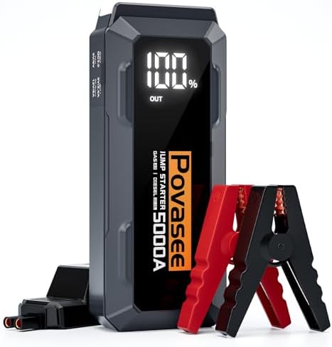 5000A &88.8WH Jump Starter Beast:Povasee 5000A jump starter can jump start ALL Gas or 10L Diesel Engines ease in seconds. Even if the battery voltage is too low (below 9V), pressing the “RST” button will help the engine to restart.A40 jump box up to 60 times jump-start on a single charge,no more struggling with dead batteries.A40 jump starter suit for for 12V vehicles, truck, motorcycle, boat, RV or tractor ATVs, UTVs, lawnmowers.