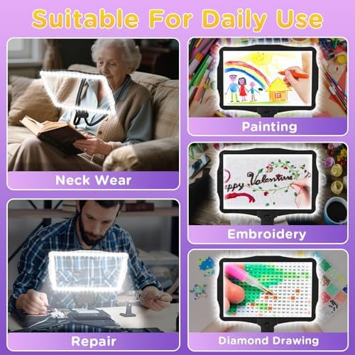 Extra Large and Clear Viewing Area:The large magnifying glass has a viewing area of 10.6 “x 7.8”. Larger size and better visual effect than existing neck magnifiers on the market. You can view a larger area without repeatedly moving the magnifying glass