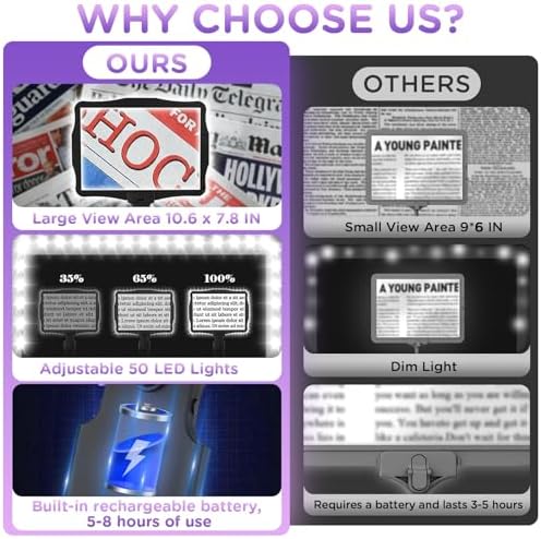 Adjustable LED Brightness: Features 50 built-in LEDs with dimmer switch for customizable brightness. Easily adjust three brightness via dimmer switch to suit any environment. The lighted magnifying glass provides optimal lighting for comfortable reading and detailed tasks, reducing eye strain