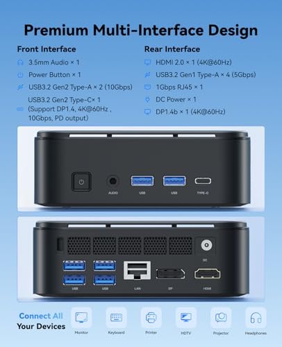 [4K Triple-Display Capability] Powered by an integrated AMD Radeon Graphics processor (7 GPU cores, 1600 MHz clock speed), this mini PC delivers stunning 4K visuals with exceptional clarity and vibrant color. It supports triple-display output via HDMI, DisplayPort, and USB Type‑C ports, allowing seamless multitasking across multiple screens—perfect for boosting productivity, enjoying immersive content, or handling light gaming with smooth, ultra-realistic visuals.