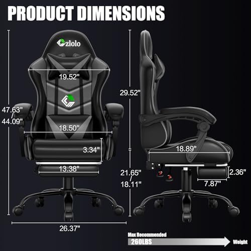 Ergonomic Grey Gaming Chair: There is a small pillow on the top to protect your neck and avoid soreness. The backrest is widened to accommodate your shoulders, making you more comfortable to lean on. There is also an additional lumbar support massager that can vibrate to relieve your fatigue. The armrests have added sponge pads, which will feel softer when you lean on them.