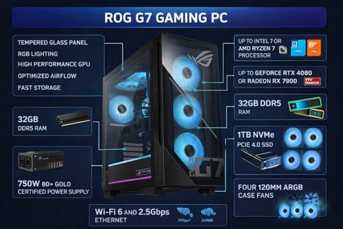 The ROG G7 features an efficient air cooling system and a 600W 80 Plus Gold power supply for stable, dependable performance under heavy workloads. Windows 11 comes pre installed, and the system includes an RGB keyboard and mouse. This bundle also includes a 12 month CPS extended protection plan for added confidence and long term support.