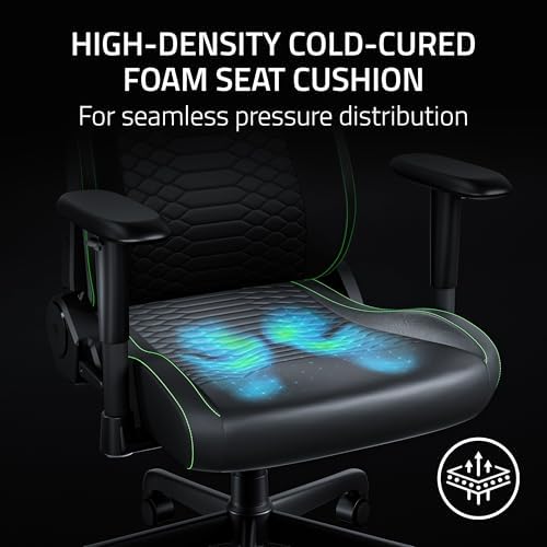 Set yourself up for hours of uninterrupted gaming with the Razer Iskur V2 X NewGen—our essential ergonomic chair built to deliver lasting comfort and support. Wrapped in the latest Razer Gen-2 EPU Leather with CoolTouch™ Technology, it offers a noticeably cooler, more comfortable feel, making it you perfect throne for marathon gaming sessions. Thirteen times more durable than regular PU leather, this premium material retains smooth resilience while elevating performance where it matters most. Its Built-In Lumbar Support keeps you steady through marathon sessions, encouraging a neutral sitting position to minimize back fatigue. The High-Density Cold-Cured Foam Cushion ensures seamless pressure distribution, resisting sagging while delivering plush comfort that lasts. With Ultra-Wide Shoulder Arches and Seat Base, enjoy freedom to shift positions naturally—whether cross-legged or reclined. Ultra-Durable 2D Armrests let you fine-tune height and angle for personalized support, while resisting peeling and cracking. Finally, an adjustable recline of up to 152° gives you flexible positioning for gaming or relaxation. Level up your setup with the ultimate blend of style, durability, and ergonomic design—crafted for gamers who demand more.
