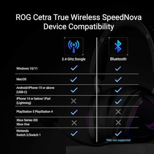 Multi-Platform Compatibility: Bluetooth mode supports PC, Mac, iOS, Android, and Nintendo Switch; while 2.4 GHz mode supports PC, Mac, Android, Switch, PS4/PS5. The Cetra TWS SpeedNova is also a top choice for use with ROG Xbox Ally / Ally X